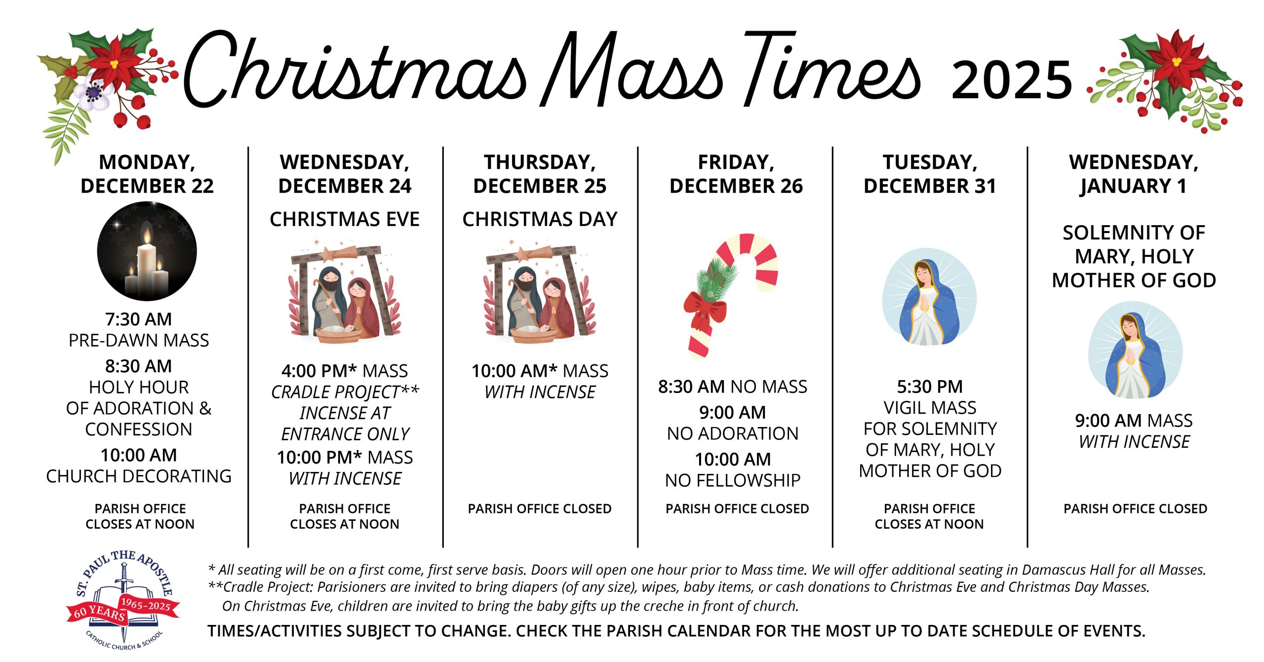 Whether you’re looking for a church to call home, just visiting, or are interested in learning more about the Catholic faith, St. Paul the Apostle is happy to have you. If you have any questions, feel free to hit the “Ask” button, and we will get back to you as soon as we can.